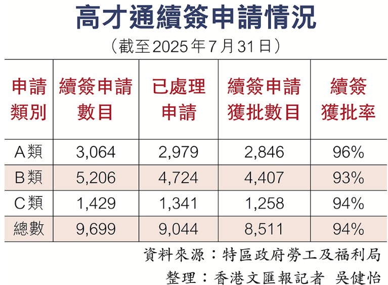 高才通计划于2022年底推出,高收入及指定高校毕业生可在无须受雇情况下申请签证来港。计划推出以来反应踊跃,截至上月底共收到近14万宗申请,其中约11万宗获批、逾9万名高才已抵港。同期,共有13,678名「高才」的逗留期限已届满,7,394人申请续签,连同签证/注将于3个月内到期并提前申请续签者,近9,700人已申请续签。